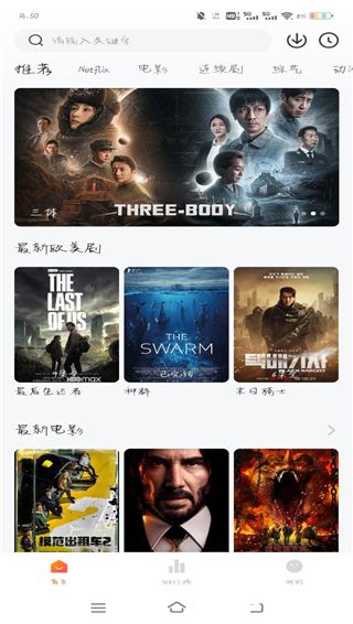 1、首先打开软件,首页为用户带来了大量的影视推荐,最新欧美剧,最新电影,热播电视剧等,点击上方的搜索栏可以快速进行搜索