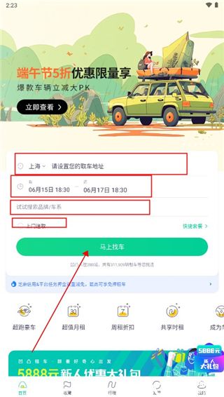 1、首先注册并登录软件,在首页中设置取车地址,租车时间,换车时间,选择汽车的品牌和车系,随后点击马上找车