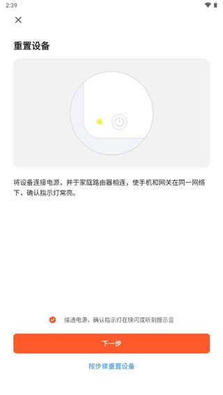 3、将设备连接电源,并于家庭路由器相连,使手机和网关在同一网络下,确认指示灯常亮,点击下一步,随后等待设备连接即可