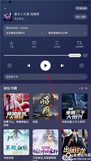 2、在章节首页中,点击右上角的听书即可进入听书页面,点击播放即可