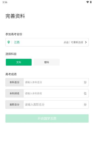 1、首先进入软件之前,用户需要填写参加高考的省份,选择科目和填写高考成绩