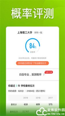 录取概率评测、志愿风险评估、能上的学校、按分数选专业、专业数据对比等超级实用功能,助你快速锁定大学和专业。