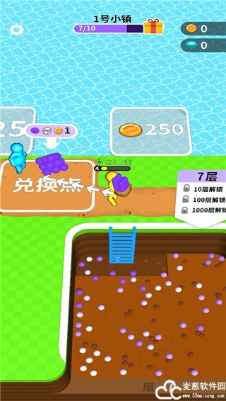 3、在挖土时会出现紫色的矿石,这些手机起来可以前往兑换点换金币