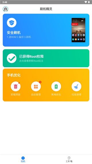 1、打开软件,这里为用户提供了大量的功能,安全刷机,卸载预装,自启管理等,帮助用户更好的管理手机