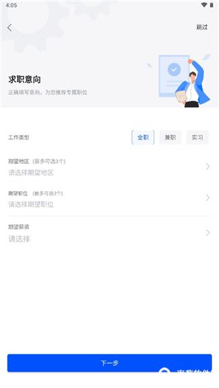 2、在求职意向页面中,你需要填写工作类型,期望地区等内容,也可以直接跳过