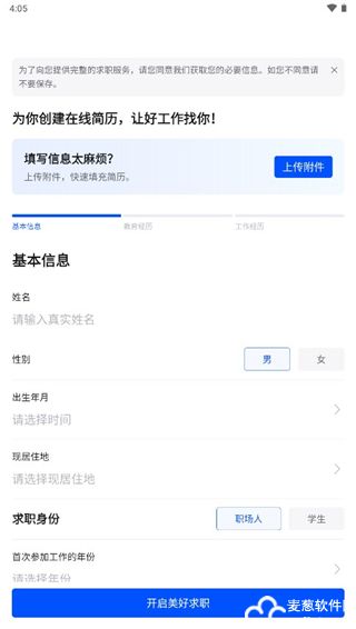3、在创建简历页面中,用户可以直接导入简历,也可以手动填写,完成之后就可以开始求职了