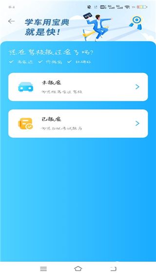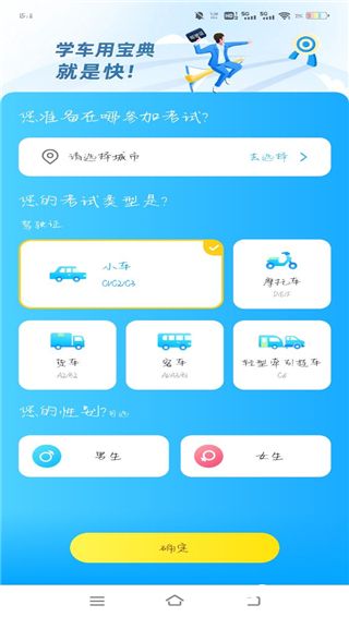 1、首先打开软件,选择自己考驾照的城市,考试类型和自己的性别,点击下方的确定,随后系统会询问你是否报名驾校,如果没有报名会为你推荐离家近,价格低,口碑好的驾校
