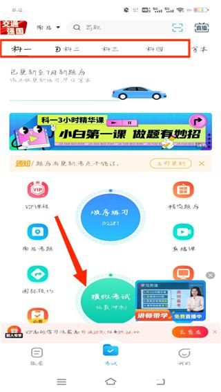 2、进入软件之后,在上方可以选择你要考试的科目,点击下方的模拟考试可以进行对应的考试
