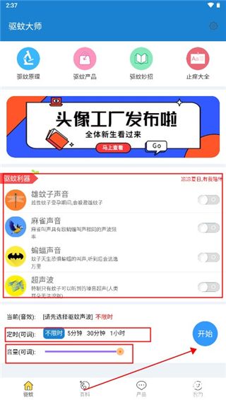 1、首先打开软件,这里为用户带来了四种蚊虫驱赶方式,雄蚊子声音,麻雀声音,蝙蝠声音和超声波,选择其中一种方式并完成定时和音量调节,点击开始