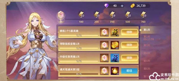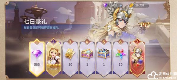 每日登录游戏即可获得当日惊喜奖励!钻石、5星英雄蕾拉、高级招募券,第七日还可获得超强实力的6星英雄芙蕾雅哦!