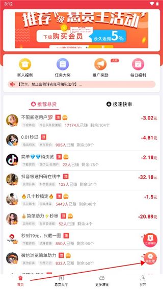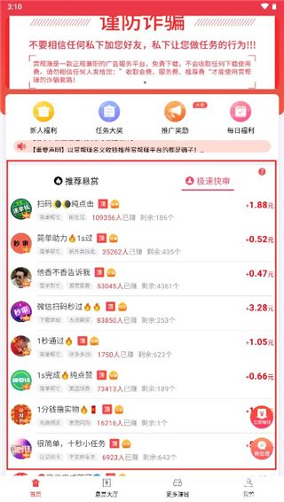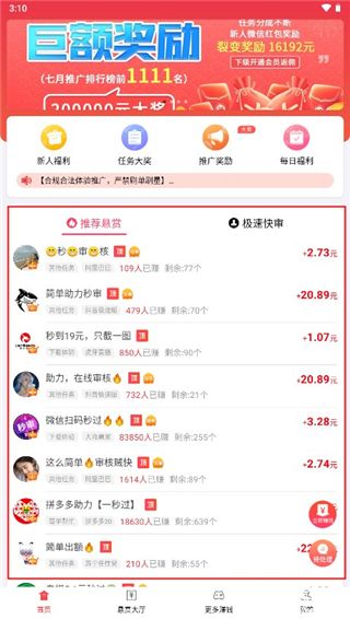 1、首先进入软件,这里有两种任务,推荐悬赏和极速快审,推荐悬赏中,悬赏的金额较高,而极速快审的审核非常的快