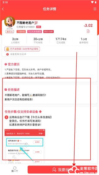 2、选择一个看中的任务进入详情页,这里有任务的描述和任务的步骤和限制,当用户满足要求之后,点击下方的我要报名即可