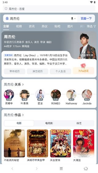 2、进入到搜索页面之后,在上方的搜索框中输入想要查找的信息或关键词,小编以周杰伦为例,输入并点击搜索