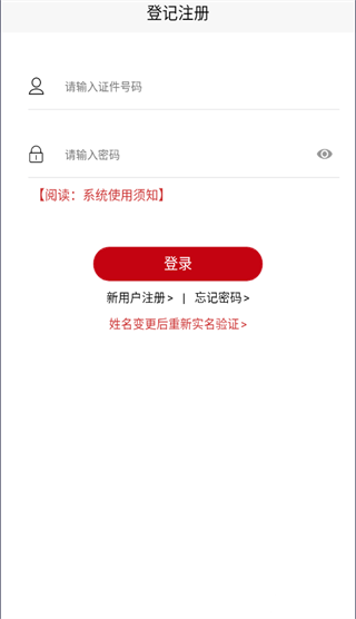 3、然后就来到了登记注册这个环节,如果是之前已经注册的用户输入证件号码和密码就可以,如果用户之前已经注册了,但是忘了密码,我么也可以点击忘记密码,来重新设置密码