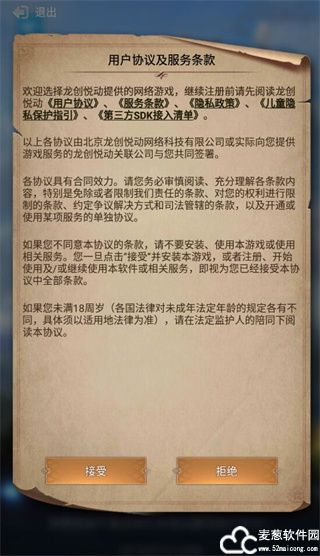 1、第一次点开游戏,系统会弹出一个用户协议和服务条款的窗口,点击接受即可