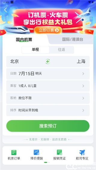航旅纵横app官方版是一款专门为那些喜欢旅游的人打造的交通出行服务软件,在这里为用户带来了多种不同的出行方式,飞机,火车等,并为用户的旅程提供便利的服务,比如用户在下飞机或者是出火车站的时候很难打到车,可以在这里提前预订好接送的出租车,只需要将飞机或火车的抵达时间发送给司机,司机就会按时抵达上车地点,并将用户送至目的地,还可以根据自己的出行计划来预订酒店,订购机票,订购火车票等,让自己的出行更加的方便。在航旅纵横中,轻松订购机票,只需要填写自己的出发地点和目标地点,并设置出行时间,乘客数量等内容,就可以将所有符合条件的航班提取并显示出来,大家可以在这些航班中找一个最令自己满意的进行机票预订。