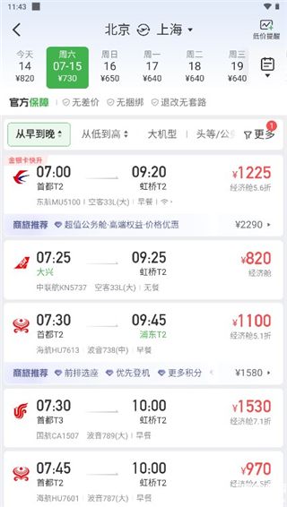 2、系统会根据用户填写的信息将所有符合的航班推送给用户,用户需要选择一个合适的航班并点击进入详情页面