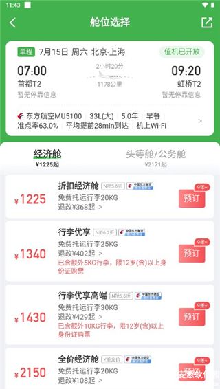 3、在详情页面中,用户可以在这里选择是乘坐经济舱还是头等舱/公务舱,随后根据自己的行李选择预订即可