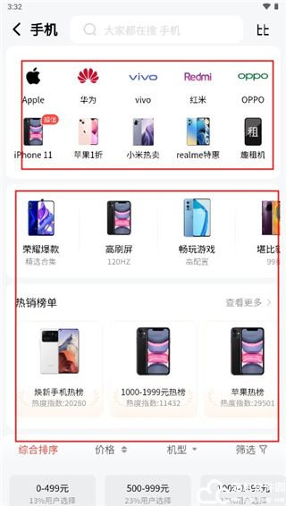 2、进入分类之后会有更细致的划分,如手机的品牌,内存,处理器,价格等
