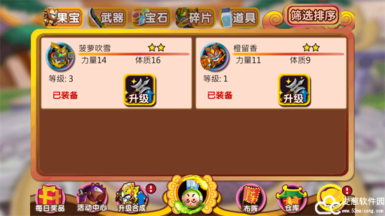 2、点击主页的升级合成按钮可以对你的果宝、武器等进行升级合成