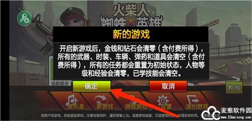 1、进入游戏的主界面,点击下方的新游戏,开始之前会出现游戏提示,是否开始新的游戏,点击确定