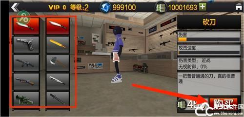 2、在商店中,这里有着大量的武器装备,刀,手枪,冲锋枪,榴弹,火箭筒等,只要拥有足够的钞票就可以直接购买,选中武器之后点击右下角的购买即可