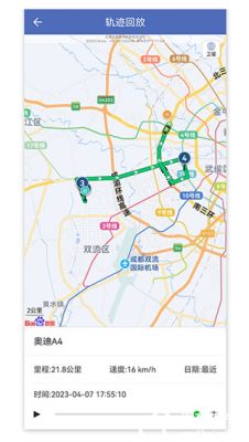 1、轨迹回放:支持回放180天内行车轨迹,回放过程中可显示车辆当时的车速、方向、停留时间等。
