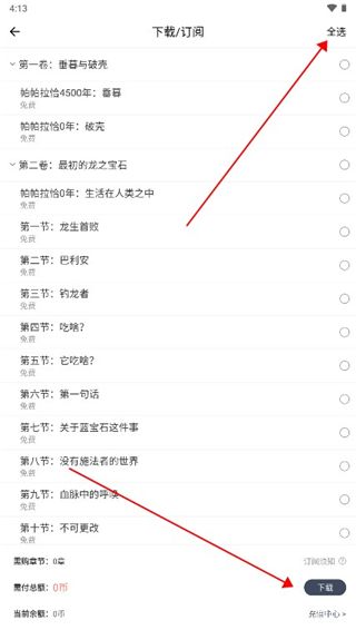 3、在缓存页面中,点击右上角的全选,将所有的章节选中,兑换点击右下角的下载,随后只需要等待下载完成即可