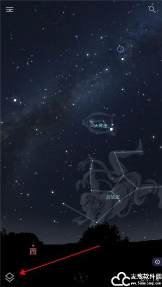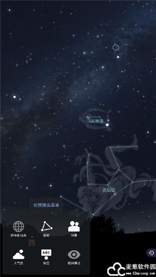 2、进入黑夜之后,点击左下角的菜单选项,这里为用户带来了多种功能,星座,地景,大气层等,长按可以打开详细功能