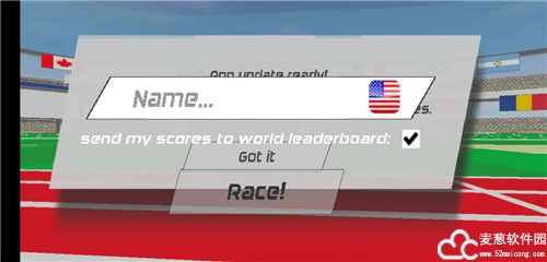 1、首先进入游戏,首先需要设置自己的名字和国旗,完成之后点击Race比赛