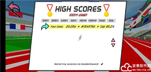 速度之星游戏破解版最新版是一款以跑步为游戏主题的竞技类游戏,你将会成为一名顶尖的运动员,在赛场上与不同的对手进行比赛,游戏中为玩家带来了多种模式,百米短跑,二百米短跑,四百米中跑等,在玩法上并没有多少差异,但是距离越长是需要的时间就越长,你需要控制好你的跑步节奏,这样才能在比赛中脱颖而出。在速度之星中,玩法非常简单,只需要在左右屏幕上向上滑动即可,注意,千万不要同时滑动,这样并不会跑的更快,只会让你跳起来,影响你的成绩,还需要注意的是,不要抢跑,抢跑是没有用的,只有当屏幕出现了浅绿色的画面时才可以开跑。此外,游戏会记录下玩家的每一次比赛,你可以在High Scores中查看自己的成绩。