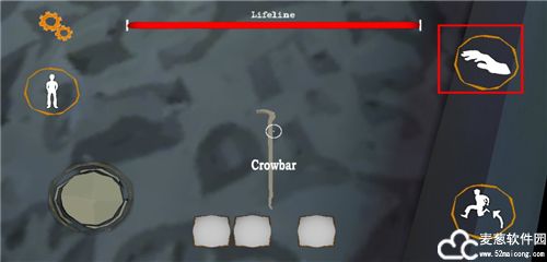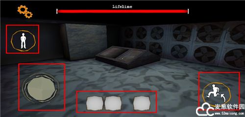 4、开始游戏之后,在右下角的是跳跃,左下角的是移动遥杆,在这上面的则是站立/蹲下,正下方的则是物品栏