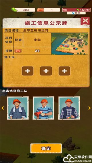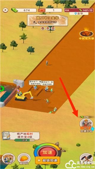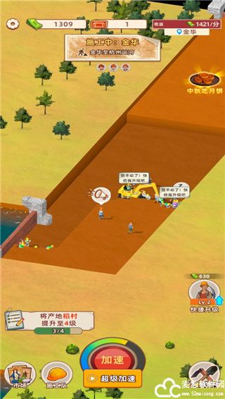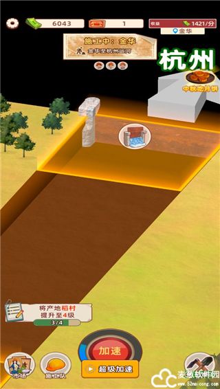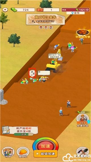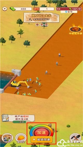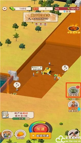 1、开始挖掘之后,我们需要选择包工头和施工队伍,点击下方的加速可以加快挖掘速度