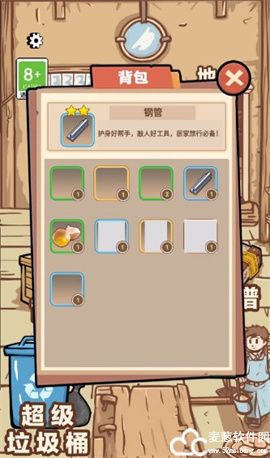 1、这是游戏界面,国内主流的休闲类画风,开始可以在垃圾桶里捡到废品;
