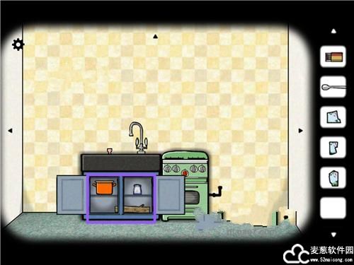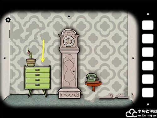 首先我们面对的是一个装有大钟的墙,我们可以在一个放着盆栽的柜子上找到火柴和勺子。接着,我们向右转换视角来到有窗户的一面,开灯并拿到天花板灯罩内的一片照片碎片,并打开窗户才得到另一片照片碎片。
