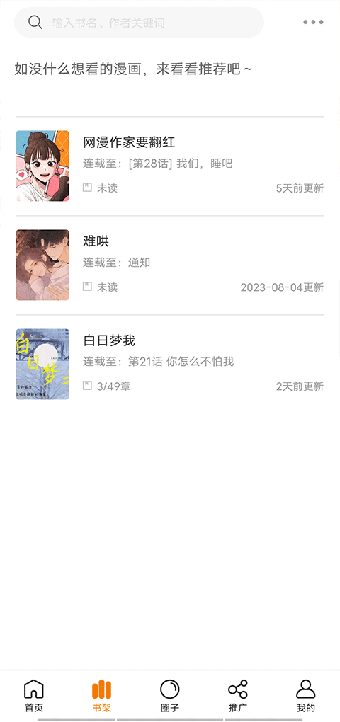 如果你有喜欢的漫画可以添加到自己的收藏夹中随时阅读,也可以分享给好友一起追漫。我们会根据大家的阅读喜好为您推荐感兴趣的漫画题材,使用一段时间后你会发现我们之间越来越默契,总能轻松找到所爱。