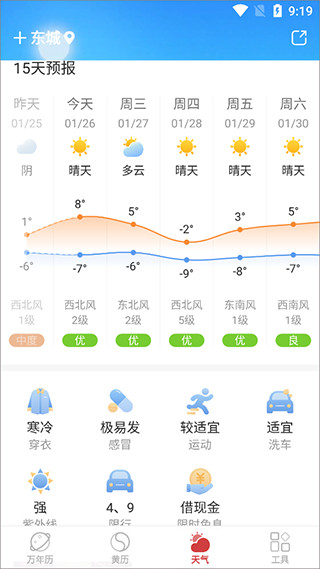 4、选择天气选项,可以查看当日天气及未来15天天气预报