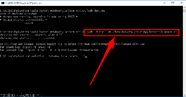 14、设备列举后,输入“.adb -d shell sh /data/data/me.piebridge.brevent/brevent.sh”命令,完成授权;
