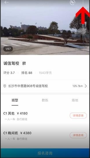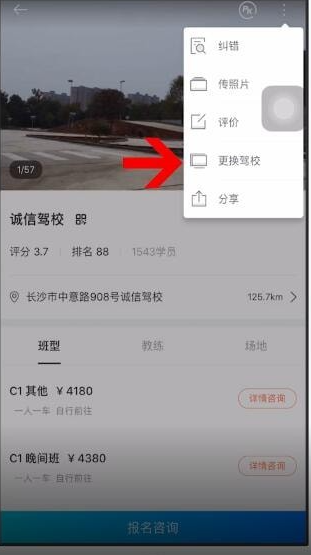 3、点击页面右上角的“三个点”图标,选择“更改替换驾校”。