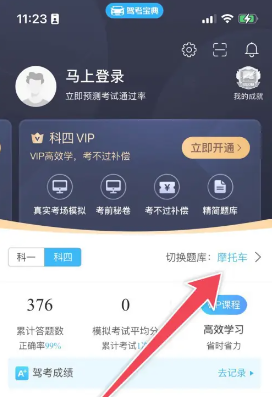 2、在“我的”界面,找到并点击“切换题库:摩托车”。