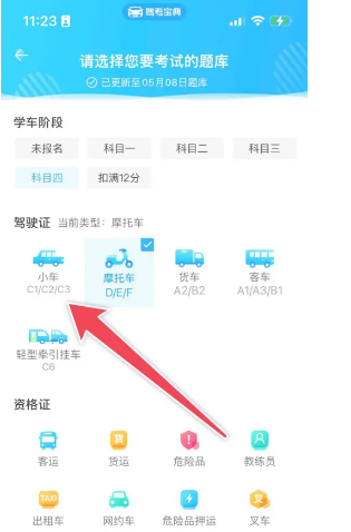 3、在“驾驶证”界面,选择并点击“小车C1”进行题库切换。