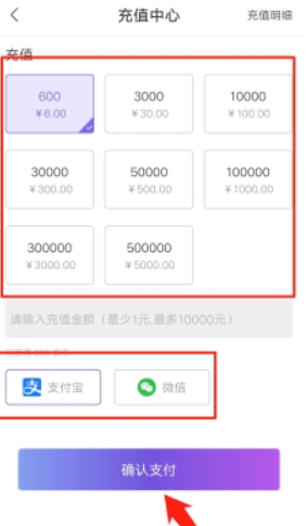 3、大家可以任意选择充值的金额,或者直接下方输入数值,确定后选择支付方式进行支付即可。