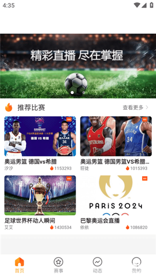 2、首页推荐的比赛都是实时转播的,当下正在进行的。