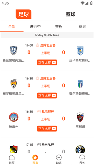 3、所有的赛程包括足球和篮球都可以轻松查看,时间、即时比分、球员数据等。