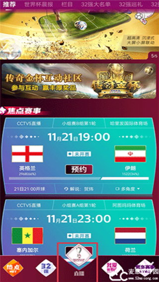1、在麦葱软件站下载后打开,首页会有当下热门赛事转播,点击下方直播可以了解所有正在进行比赛。