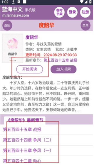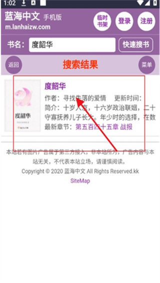 2、比如我想看度韶华这部小说,搜索后就会出现对应的作品内容。