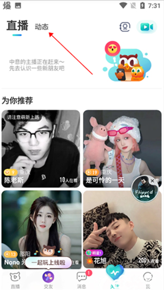 2、这里有两个页面可以选择,一个是【直播】,一个是【动态】