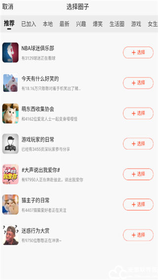 2、选择你想要发布的圈子,NBA球迷俱乐部、今天有什么好笑的、游戏玩家的日常等,各种互动圈子乐不停。