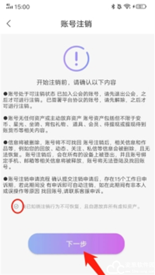 3、开始注销前,大家需要阅读一下相关规则,账号注销后所有内容都会删除。