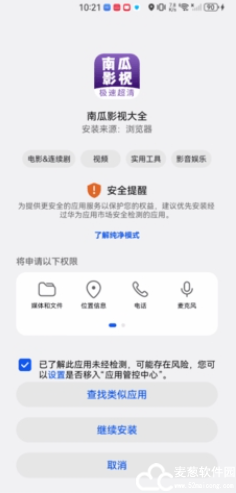 3、如果是华为手机的话,可能会出现安全提醒,不用在意,点击勾选“已了解此应用未经检测……”,然后再点击“继续安装”。